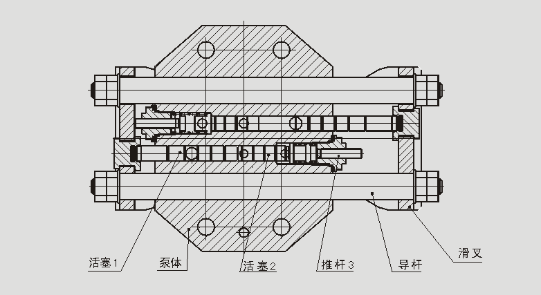 减速电机固定于带泵装置的连接法兰上,通过驱动偏心轴带动滑叉作直线往复运动,泵体内有二组活塞,每组活塞由工作活塞和控制活塞组成,当一组活塞中的工作活塞完成吸油过程时,另一组活塞中的工作活塞则把润滑脂压向出油口。如下图所示,当滑叉向左运动时,上组活塞完成吸油,下组活塞完成压油,开始新的工作循环。这时下组活塞1、2向左运动,活塞2在弹簧力作用下到达极限位置活塞1打开吸油口,润滑脂从吸油口吸入,如弹簧力不足,未将活塞2推到极限位置,此时推杆3会在滑叉的推动下强制地把活塞2压到极限位置,同时上组活塞2和推杆3的运动也就停止,活塞1继续左移,把润滑脂从出油口压出,活塞1、2接触滑叉也已运动到极限位置完成半个循环的工作,如此周而复始地循环,二组活塞交替地将润滑油脂从出油口压送出来,压出的润滑脂经泵装置连接法兰上的过滤器过滤后向系统供送。